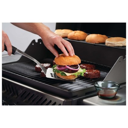 The large spatula is perfect for steaks and other large food with its bladed tip and serrated edge.