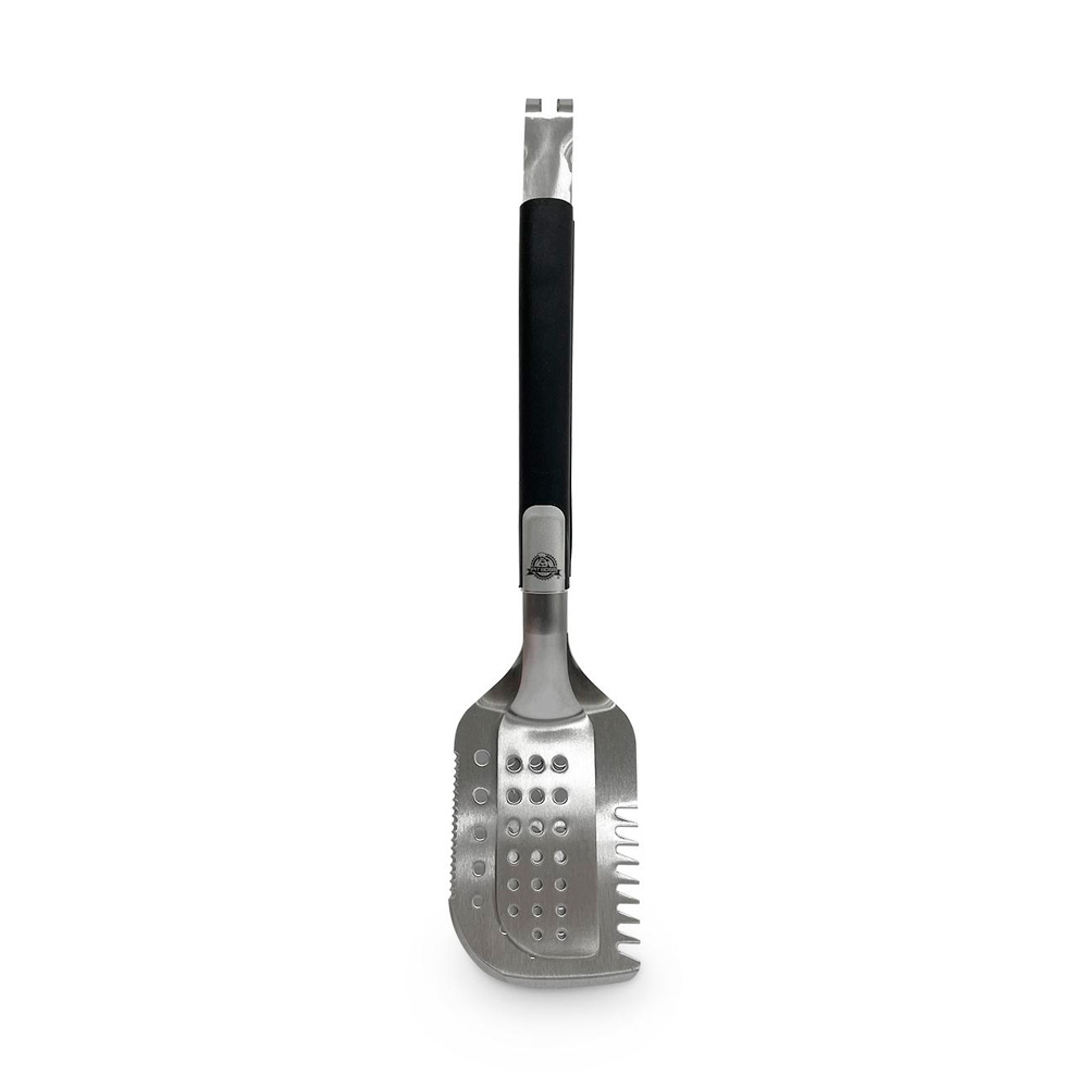 The Pit Boss Pro Series All-In-One Tool comes equipped with an extra-long, heat resistant handle, built-in bottle opener, locking tab, and extra-large hanging loop.