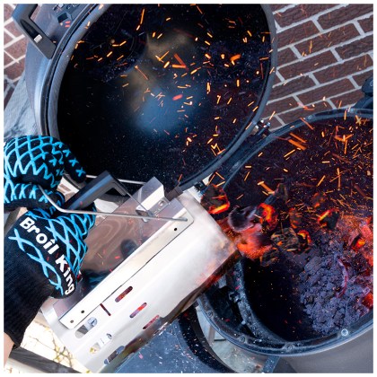 The Broil King CHARCOAL STARTER is made of stainless steel. It can hold 1kg of coals and be ready in about 10 minutes without using any kindling liquid due to its improved airflow design. The starter container has a resin handle and a special notch for placing electric lighters.