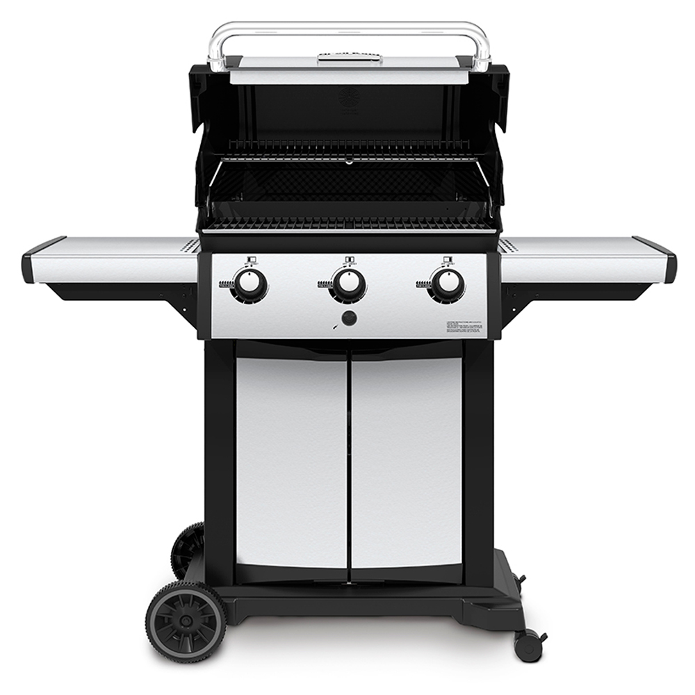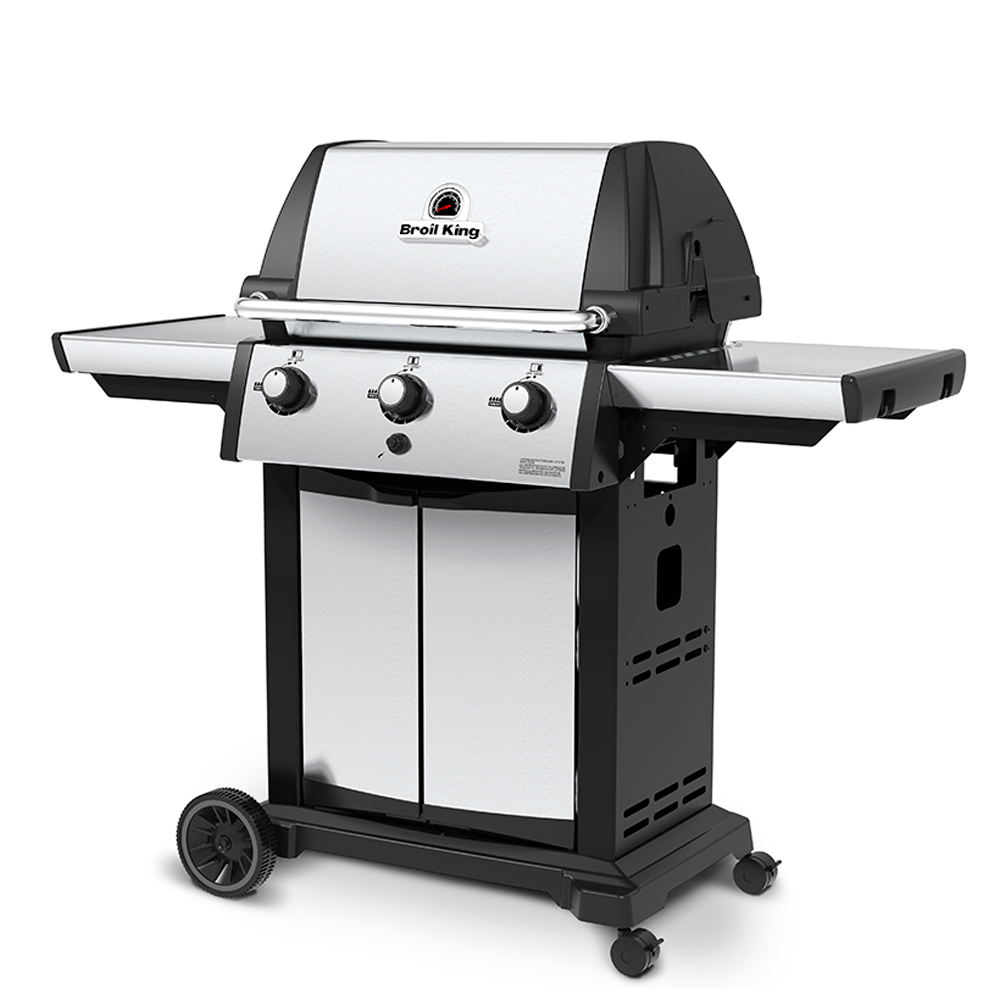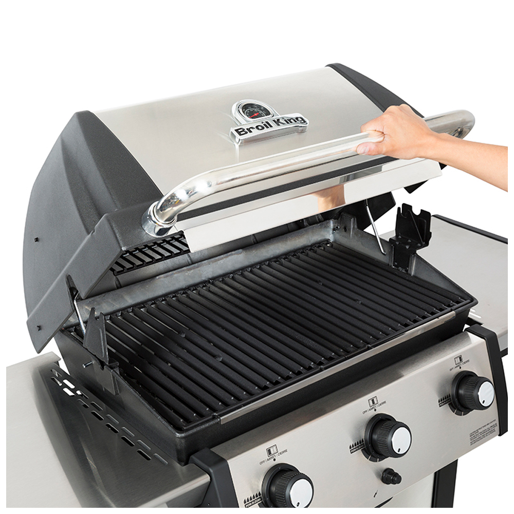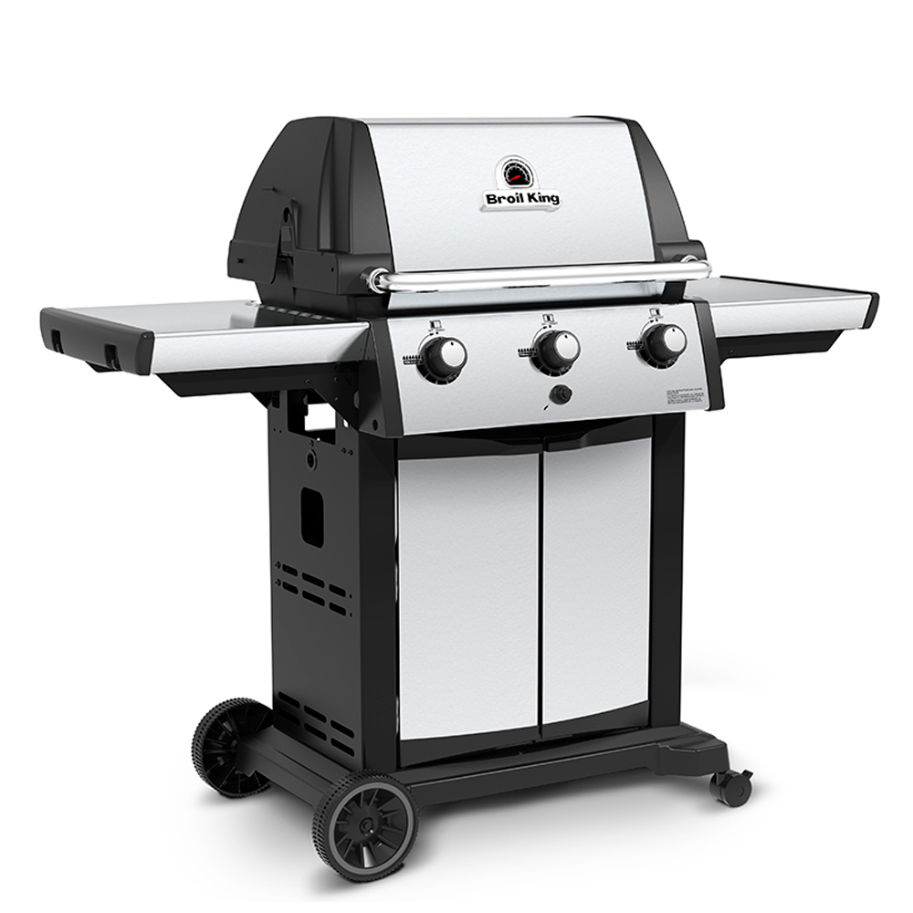 The Broil King SIGNET 320 is a Gas Grill and features 2 cast iron grill grates, a Flav-R-Wave stainless steel exhaust system, 3 stainless steel double pipe burners, a precision thermometer, an ignition system and a special place inside to place the gas bottle.