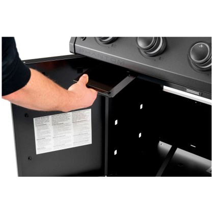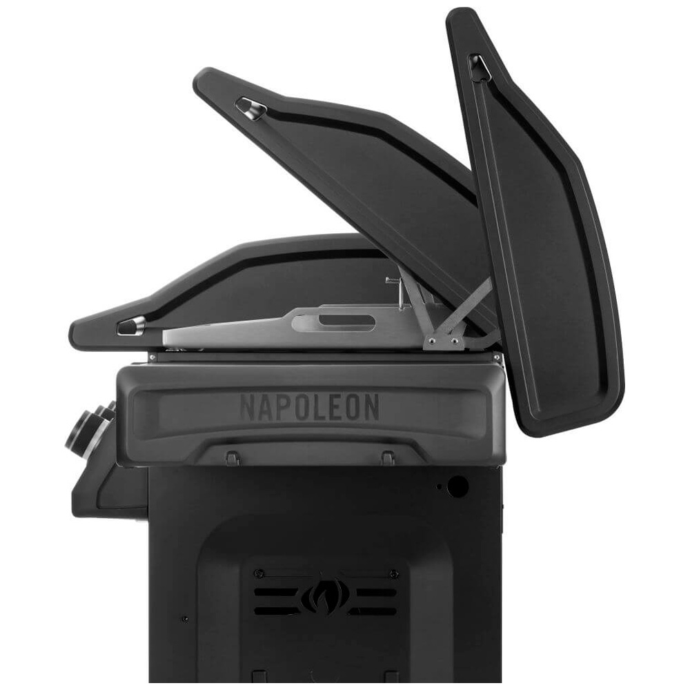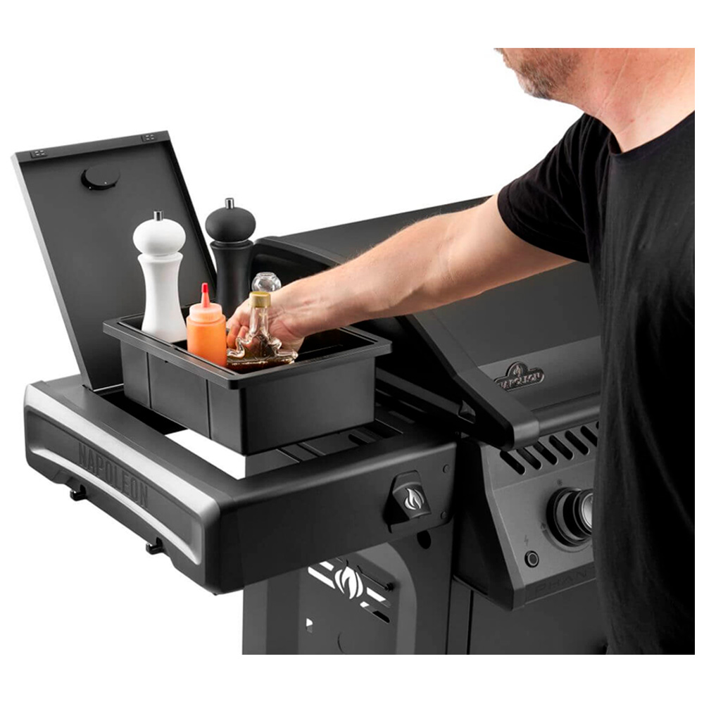 NapoleonThe Napoleon Phantom Rogue® PRO Plancha brings elegant design and culinary versatility to your outdoor kitchen. With its generous stainless steel grilling surface (70 × 44 cm) and four powerful burners delivering up to 10.8 kW, the Phantom Plancha is a full-fledged grill for those who love to grill creatively and with intense flavor – from fish and vegetables to breakfast or dessert. The sleek matte black Phantom design makes this plancha grill a true eye-catcher, but its inner values are equally impressive: LED-illuminated control knobs, foldable side shelves with a built-in bottle opener, a large grease tray, and smooth-rolling wheels ensure maximum ease of use. Another clever detail is the removable storage bin integrated into the left side shelf – ideal for prepping ingredients or as multifunctional storage space. Whether used as a main grill or a complement to an existing setup, the Phantom Rogue® PRO Plancha is made for those who value quality, versatility, and design in their grilling experience.