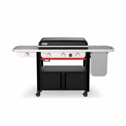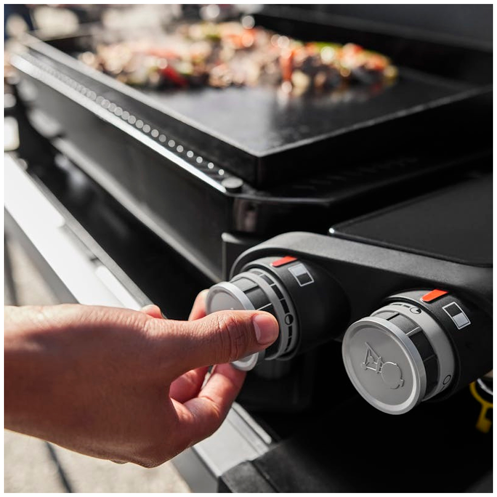 WeberDiscover cooking on the griddle outside the home with the 56 cm Premium Weber® SLATE GP griddle , with two-zone heat for cooking at two temperatures simultaneously. The cooking surface reaches a temperature of over 260°C and heats the entire surface evenly to cook food evenly anywhere on the plate. The cooking surface with a non-stick enamel finish is immediately ready to cook, so you can prepare delicious burgers, stir-fry tasty dishes, cook seafood and vegetables to perfection and much more. Thanks to the adjustable feet that allow you to level the plate on uneven surfaces and the possibility of adding an expandable support, the Premium Weber® SLATE Plate is perfect for picnics, in the garden or on any surface .