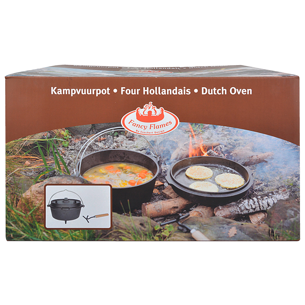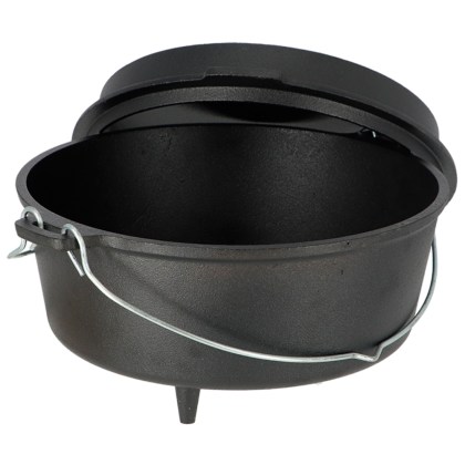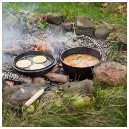 Coal or briquettes can be placed on top of the lid to create extra heat, the lid can also be used as an additional grill. It has a firm footing in or on the fire thanks to its three legs, alternatively the Dutch oven can be hung above the fire thanks to the handle’s suspension hook notch. The lid hook included makes it easy to remove the lid without using your hands.