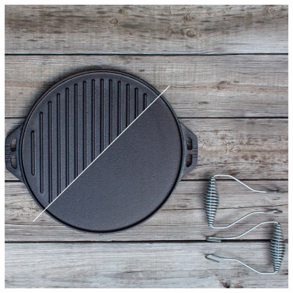 The Cook-It-All is the only outdoor cookware you need. With 5 cooking configurations from only 2 pieces of iron, the Cook-It-All brings a whole world of culinary possibilities to your campsite. The reversible grill/griddle offers a generous cooking surface and also acts as a lid. The 6.8 quart bottom is a wok and skillet, and can be inverted to become a domed lid for baking. The heavy-duty handles make it easy to maneuver the iron while keeping hands safe from heat. Purchase includes tips & tricks booklet.