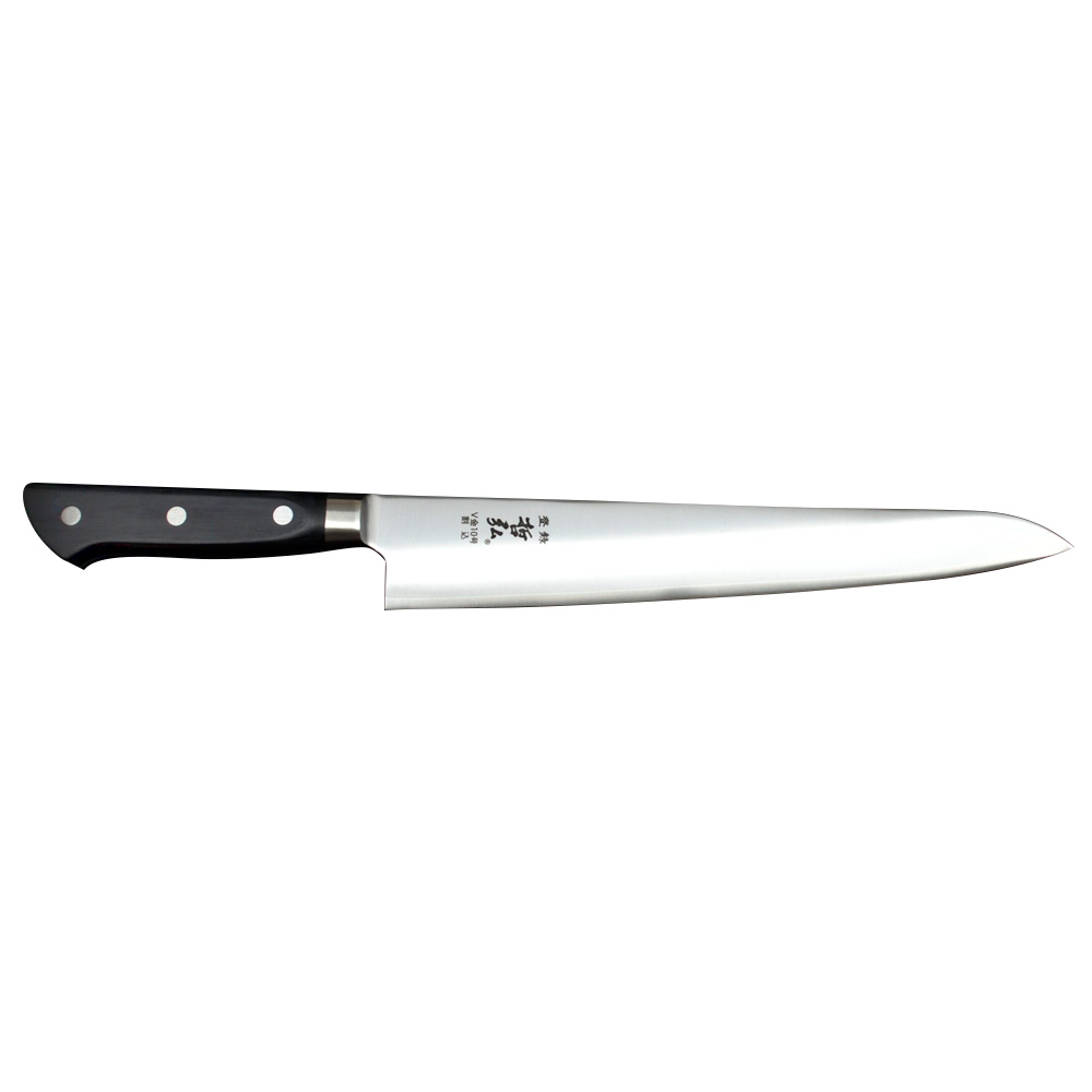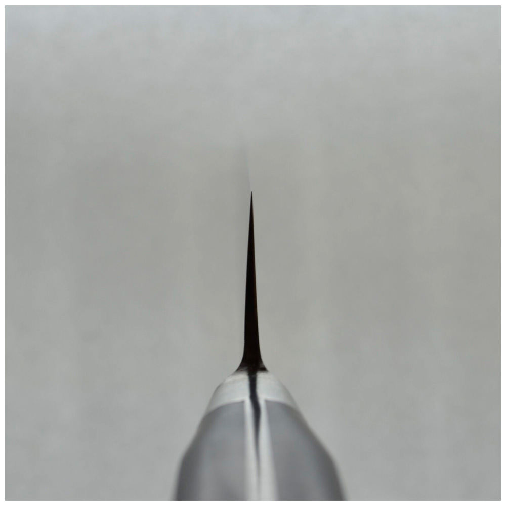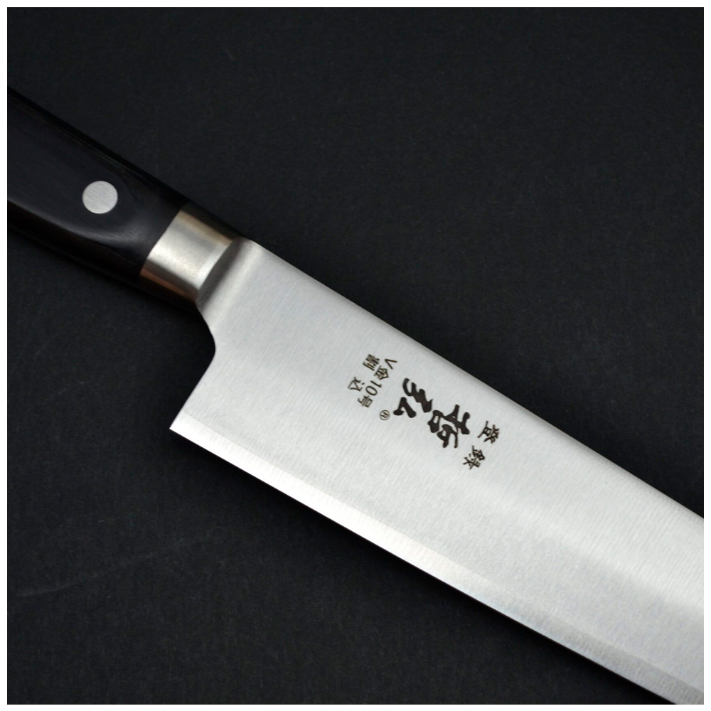 Double bevel slicer for boneless meat and fish. The name translates to “muscle cutter”. It is usually long and thin with a low profile and the purpose of it is for cutting in one single slice in order to create minimum cellular damage (That preserves the original texture and flavor of the protein). Perfect for slicing and back draw cut motions. The specific knife comes in the common size at 240mm.