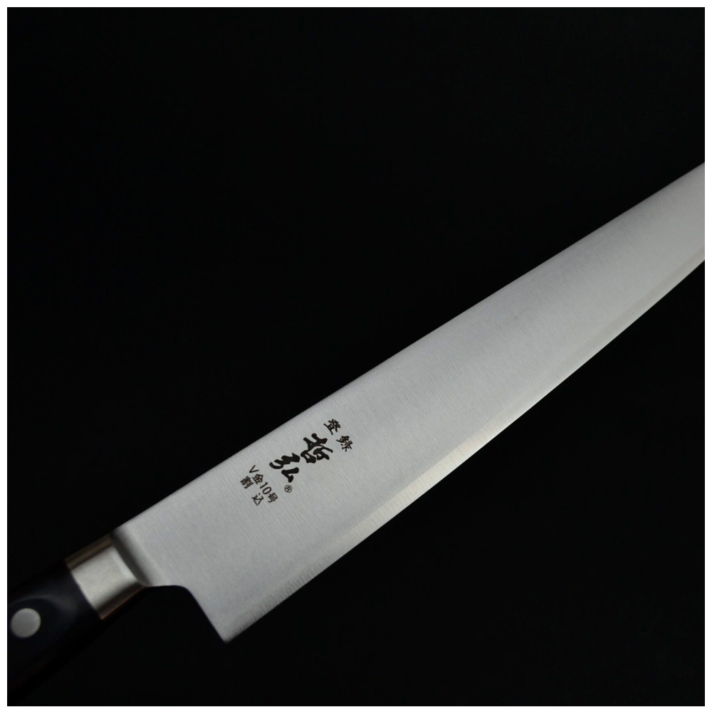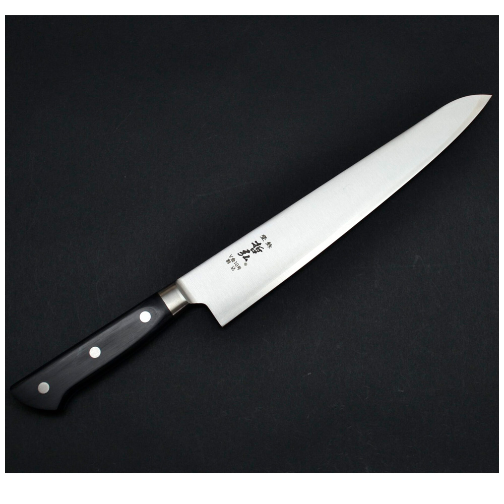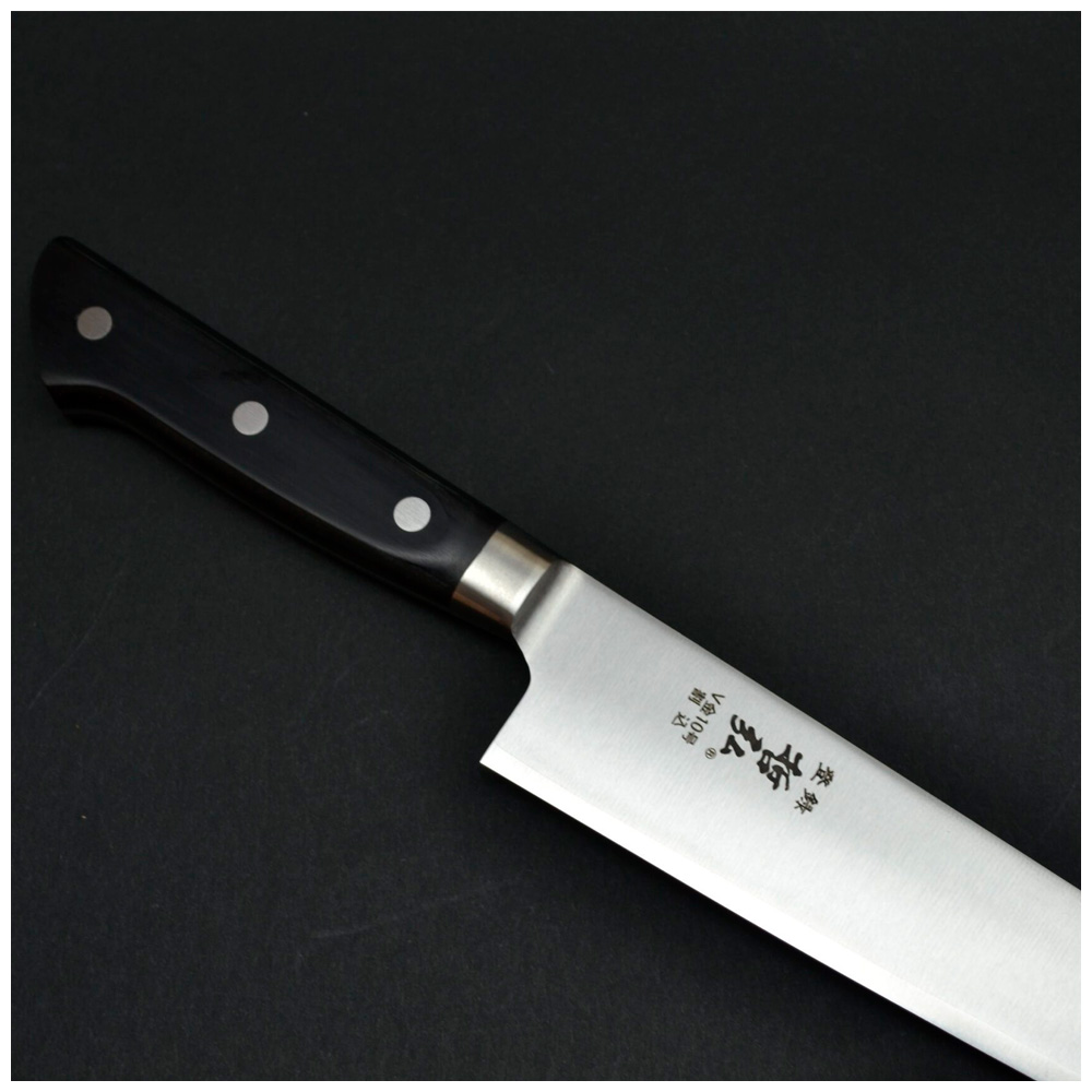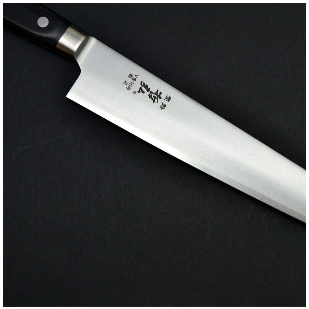 Double bevel slicer for boneless meat and fish. The name translates to “muscle cutter”. It is usually long and thin with a low profile and the purpose of it is for cutting in one single slice in order to create minimum cellular damage (That preserves the original texture and flavor of the protein). Perfect for slicing and back draw cut motions. The specific knife comes in the common size at 240mm.