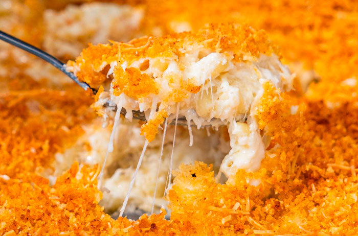 - Οδηγίες: Ετοιμάστε μια σάλτσα τυριού με γάλα και βούτυρο, ανακατέψτε το κρέας με τα μαγειρεμένα ζυμαρικά. Μεταφέρετε σε ένα ταψί, βάλτε από πάνω τριμμένη φρυγανιά και ψήστε στους 190°C μέχρι να ροδίσουν.