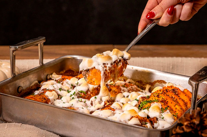- Οδηγίες: Ψήστε τις γλυκοπατάτες μέχρι να μαλακώσουν. Ανοίξτε τις σε φέτες και αφρατέψτε (σκάψτε) το εσωτερικό τους. Ανακατέψτε με το κρέας, τα φασόλια και το τυρί. Ψήστε μέχρι να λιώσει το τυρί. Γαρνίρετε με ξινή κρέμα και φρέσκα κρεμμυδάκια.